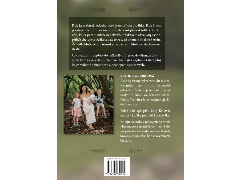 Rok jsem sbírala odvahu. Rok jsem sbírala prožitky. Rok života po smrti mého milovaného manžela mi přinesl tolik krásných věcí, kolik jsem si nikdy nedokázala představit. Skrz svůj osobní příběh chci zprostředkovat, že smrt se dá vnímat i jinak než ztráta. Že vedle hlubokého zármutku lze zažívat i hluboké, dechberoucí štěstí. Chci vrátit smrt zpátky do našich životů, protože věřím, že díky ní může každý z nás žít mnohem naplněnější a naplňující život plný lásky, vědomé přítomnosti a pochopení sebe samých.